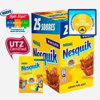 25 Sobres NESQUIK® Cacao soluble sin gluten. Preparado alimenticio al cacao de disolución instantánea en leche caliente o fría, idóneo para el desayuno o merienda. Nesquik dispone de la certificación UTZ que asegura que los productos cumplen los criterios de agricultura eficiente y producción responsable de una manera orientada al mercado.