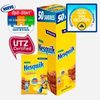 50 sobres de NESQUIK® Cacao soluble sin gluten. Preparado alimenticio al cacao de disolución instantánea en leche caliente o fría, idóneo para el desayuno o merienda. Nesquik dispone de la certificación UTZ que asegura que los productos cumplen los criterios de agricultura eficiente y producción responsable de una manera orientada al mercado.